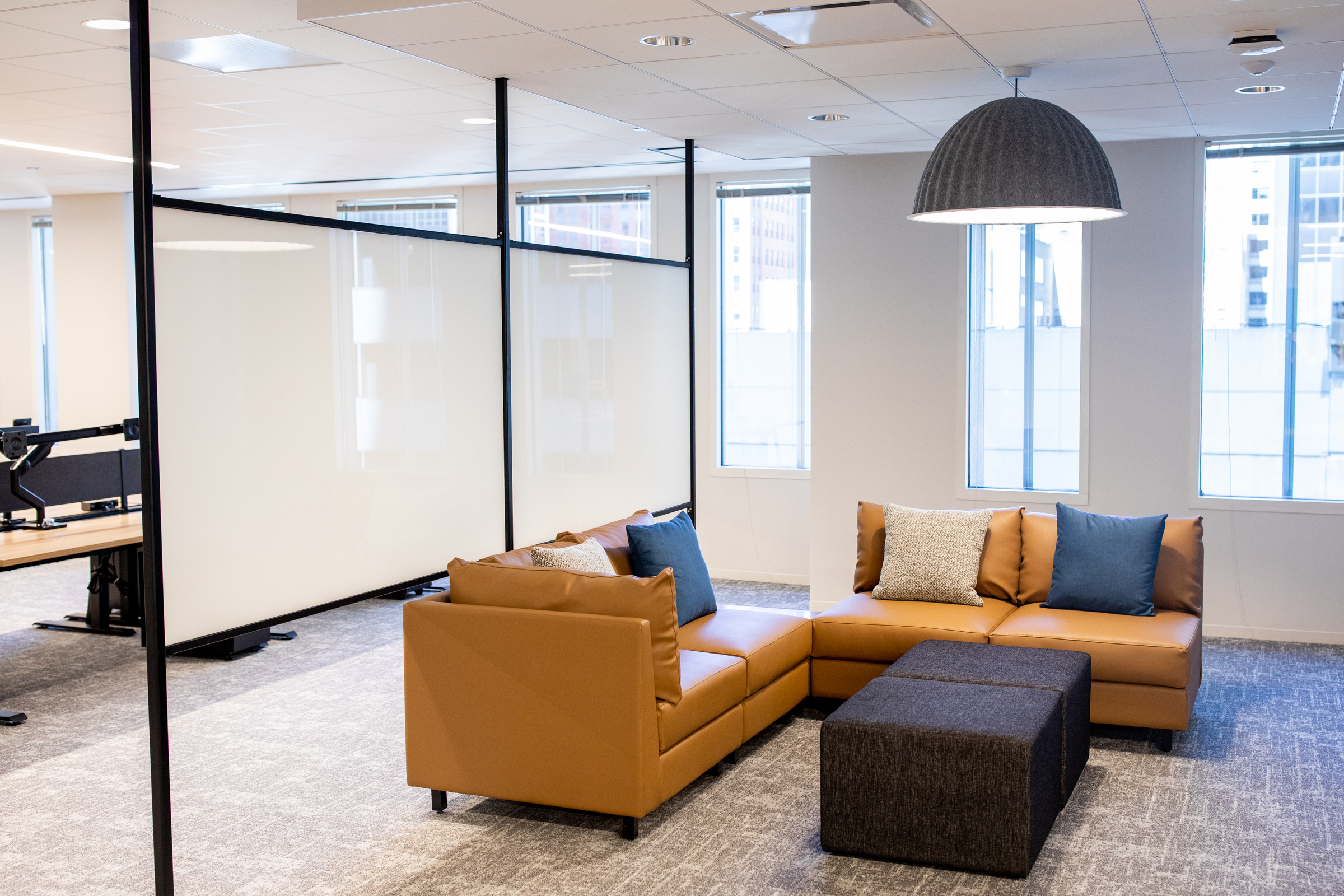 An 85,000 sq ft interior renovation project that spanned four floors, and included collaborative work and lounge areas, an open concept cafe and kitchen area, office space and conference rooms. Simple yet intricate details include carved out nooks with a curving design for breakout space, the mixture of glass, metal, marble and wood, and clean lines throughout the space – all elements that form a welcoming, breathable office for years to come.